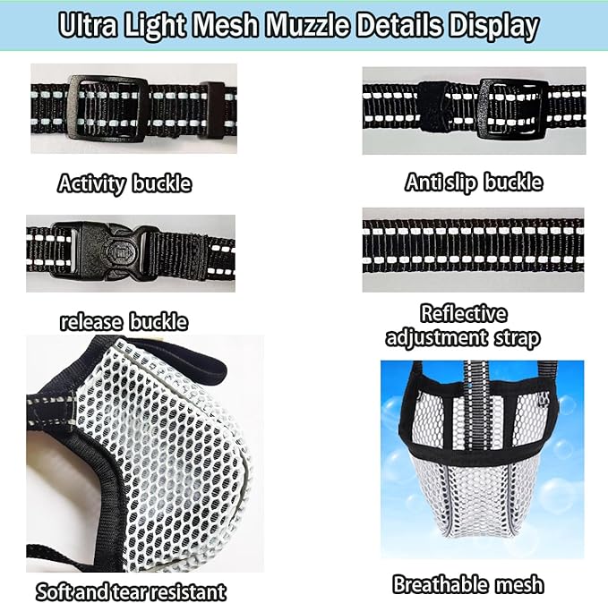 • [Soft Material,No Hurt to Skin] Dog muzzles are made of high quality fibre mesh material, full-coverage mesh muzzle, soft and lightweight, weighing only 40 grams, won't burden your dog, and won't rub your dog's nose even if it's a large dog, making it more acceptable to your dog.
