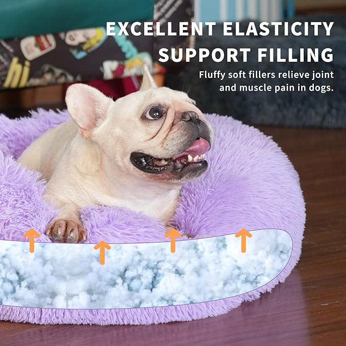 - [Superb Comfortablility] The purple dog bed small sized dog is designed for your pets comfortability. The round shape is to create a larger space and convenient for your pet to rest, the thick bottom provides the comfortable and warming cushion, and the raised rim gives the support for your pet's head and neck and the security as be surrounded. At last, the soft faux fur will let your bark buddy sink in it, and take the immersive sleeping.