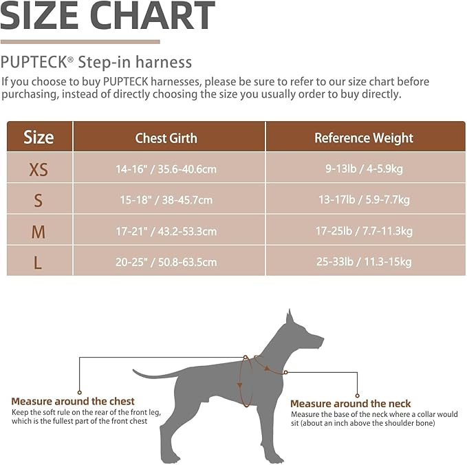 • SIZE GUIDE: [XS: Harness Chest 14"-16"]; [S: Harness Chest 15"-18"]; [M: Harness Chest 17"-21"]; [L: Harness Chest 20"-25"]. Please note that the sizing does NOT directly correspond to your pet's breed or weight, so please always measure your dog and refer to our brand size chart