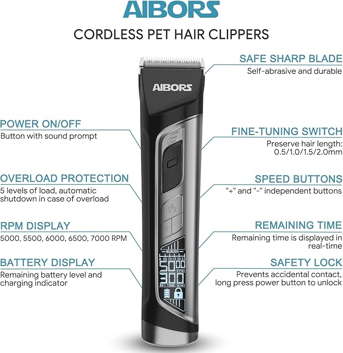 • 【Meet Your Pup’s Personal Stylist!】The Aibors dog clipper packs 5 power speeds (5,000-7,000 RPM) to breeze through fur – thick, wiry, or cotton-soft. Its laser-sharp blades snip cleanly without yanking hair, while the powerful motor laughs at tangles and mats