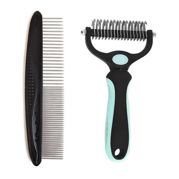 • Dual-Sided Design: This pet dematting tool features two different brushes for effective removal of loose hair, knots, and mats from your pet's coat.