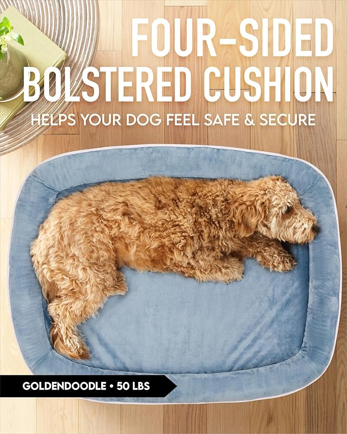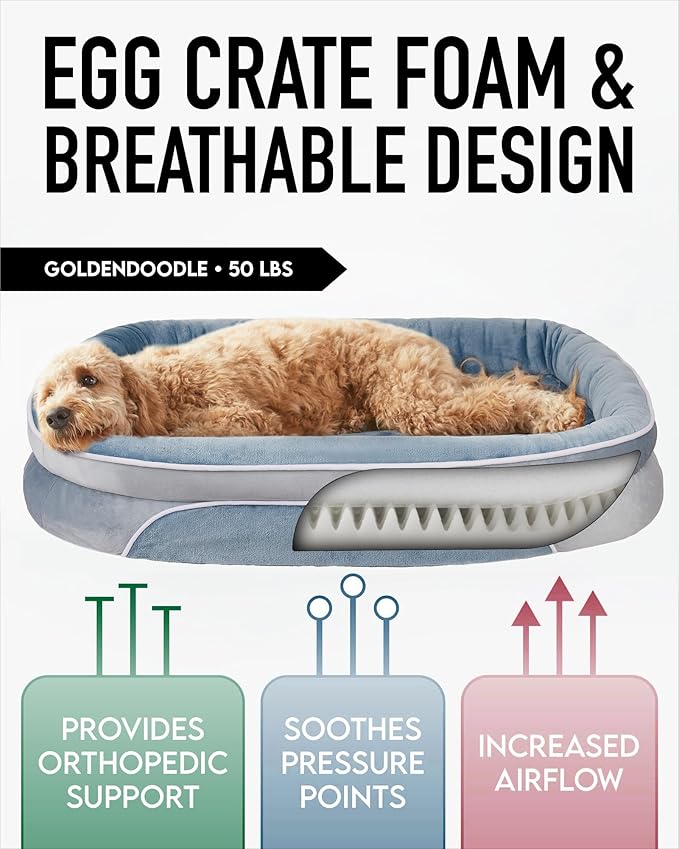 OhGeni Orthopedic Dog Bed for Extra Large Dogs, Dog Couch Design with Egg Foam Support, Removable, Washable Plush Cover and Non-Slip Bottom with Four Sided Bolster Cushion (Washed Blue)