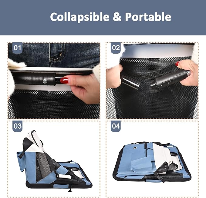 • Collapsible Dog Kennel: Three mesh entrances door (Top, front and side) for convenience sunlight and breathability; Ample Ventilation for Use in All Season. Easy carry with handle or strap. Adjustable strap included.