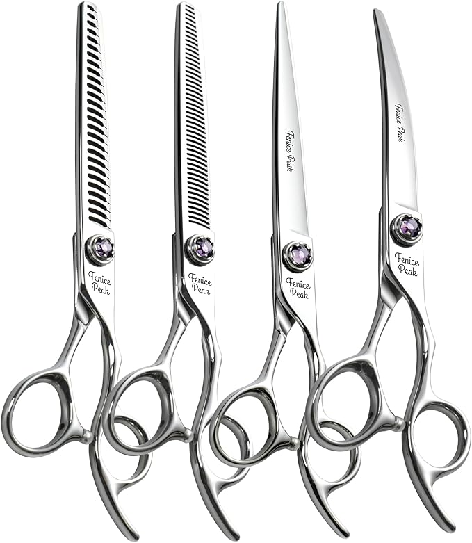 Fenice Peak 7 inch Dog Grooming Scissors Set 4PCS Straight Curved Thinner Chunker Professional Dog Shears Made of Japanese 440C Stainless Steel with Jewelled Screw Durable and Sharp
