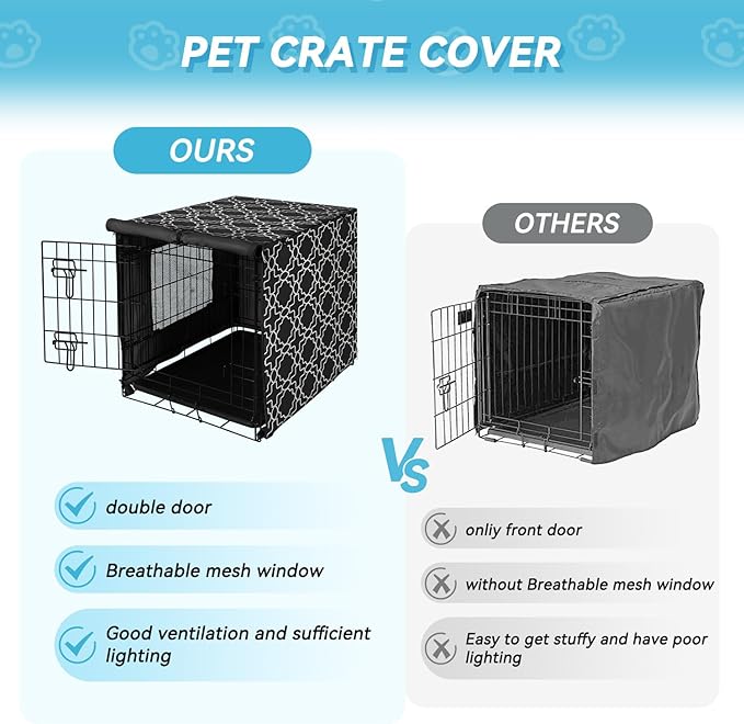 • Ventilation & Breathable: Dog crate cover two entrance doors for easy entry and exit of pets. Ventilation window behind, good visibility, can prevent dogs from getting stuffy and hot