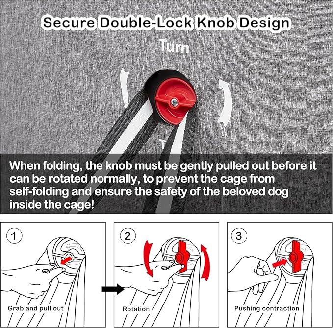 - Safety knob & Zipper &Leash: To ensure the safety of your beloved dog inside the crate, our knob is designed with a two-step locking mode. When folding, you need to gently pull it out before you can rotate it normally, to prevent the crate from suddenly folding. The safety leash inside our dog crate clips onto your dog's collar to ensure they stay safely inside it. It also comes with a heavy-duty self-buckling zipper for added security.