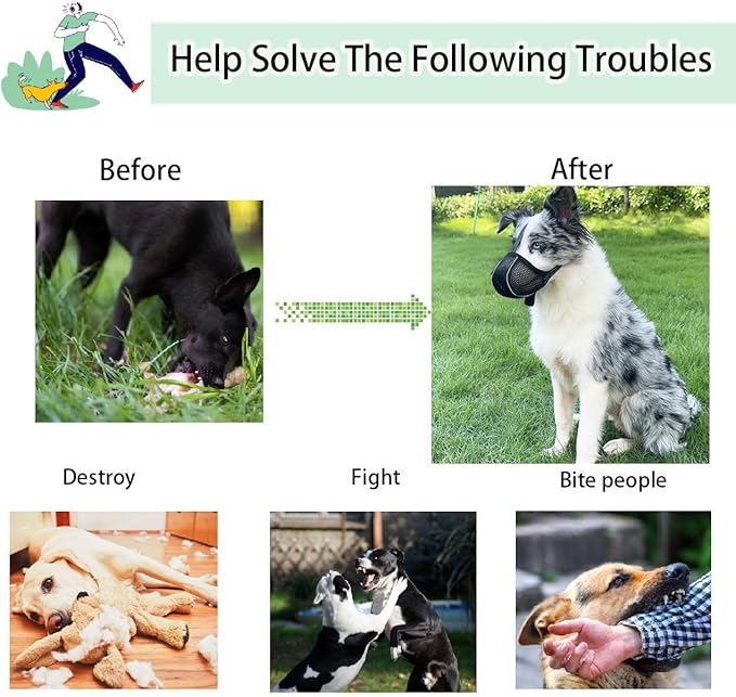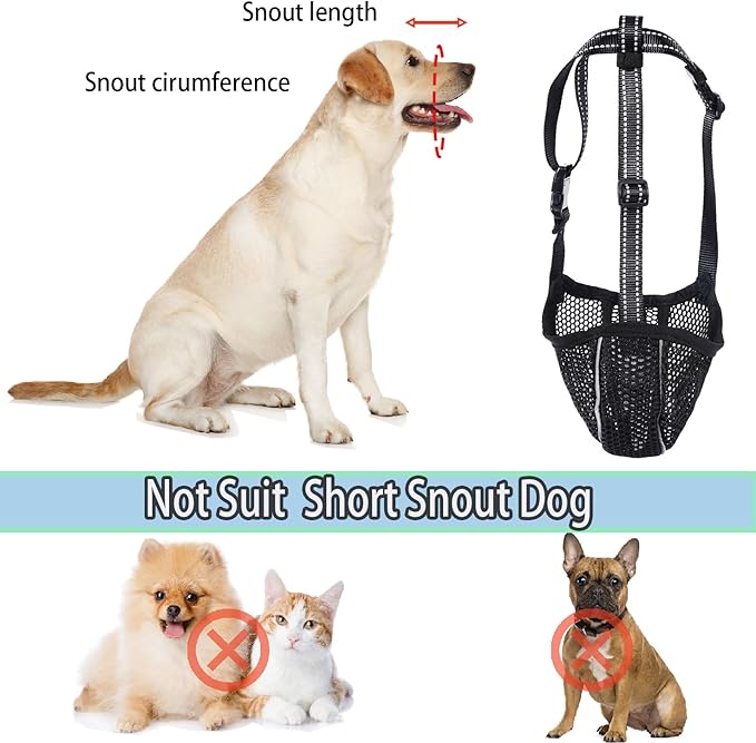 • [Measure and Size] Please measure your dog's nose circumference and nose length before purchase, the size we provide, fit for nose circumference 19-34cm, nose length 4-12cm, but not suitable for dogs with short nose, if you have any questions about the size, please email us, we will reply you within 24 hours.