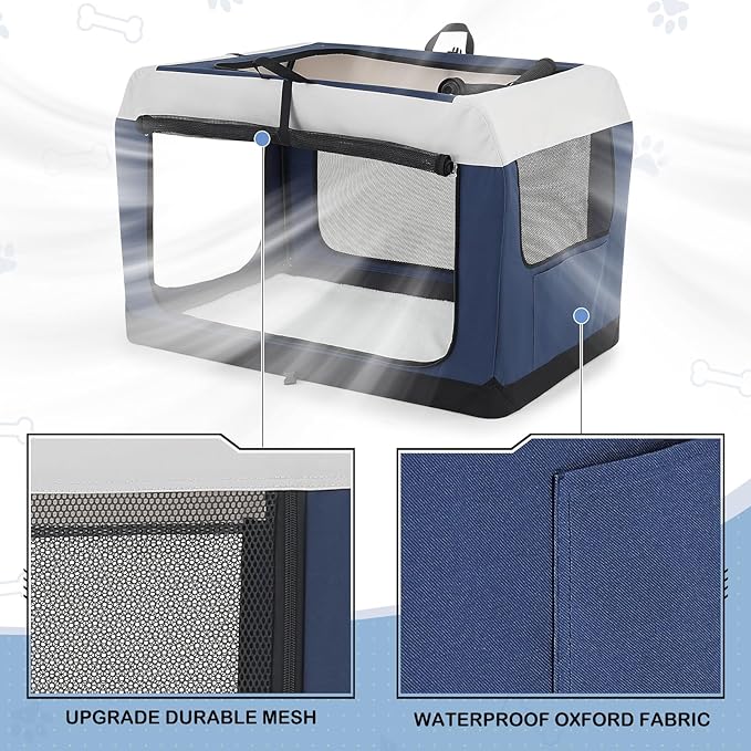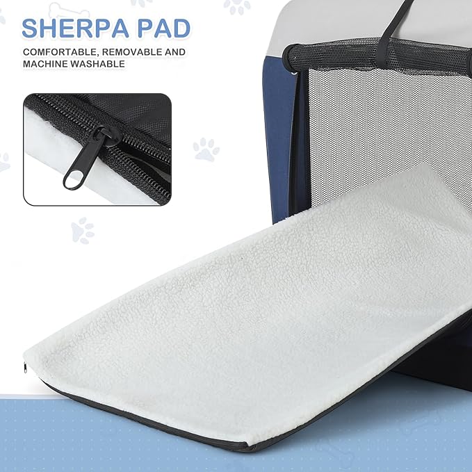 • Robust & Portable Crate Design: Engineered with a lightweight steel frame, durable Oxford cloth, and anti-bite mesh, our travel dog crate offers superior durability and safety; It features reinforced stitching and a washable sherpa mat for comfort, making it both secure and easy to transport for your pet's relaxation and protection
