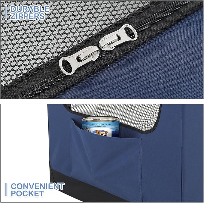 • Portable Convenience: Featuring a sturdy top handle for easy carrying and side pockets for storing treats and toys, this dog crate combines functionality with convenience, making it ideal for travel or everyday use