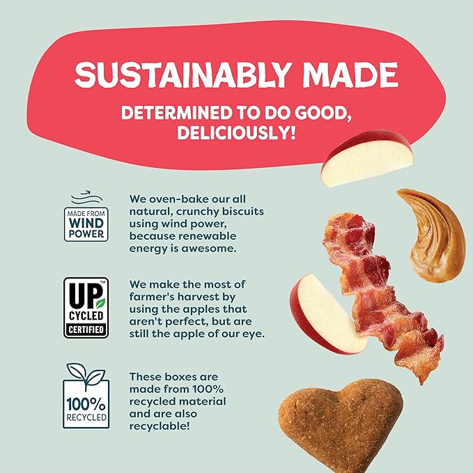 • Made with real bacon, peanut butter, and apple, your pup will love these treats. These delicious dog treats and cookies are made with fiber-rich upcycled sweet potato to support healthy digestion.