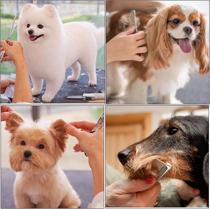 • STRONG and SHARP: dog grooming scissors are made of high quality 4CR stainless steel, Strong and very sharp, perfectly cut long and short hair for dogs, cats. All dog grooming scissors made carefully polishing and grinding, which makes blades will not rust, easy clean, and without pulling pet's hair, give you excellent cutting effect.