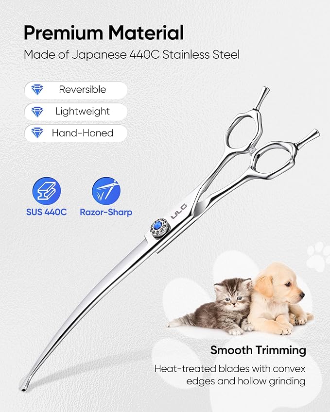 • Premium Material: Crafted from high-quality Japanese 440C stainless steel, these curved dog hair scissors for grooming are sharp, durable, and resistant to clogging. Perfect for effortlessly cutting through thick fur and stubborn tangles while delivering clean, smooth results.