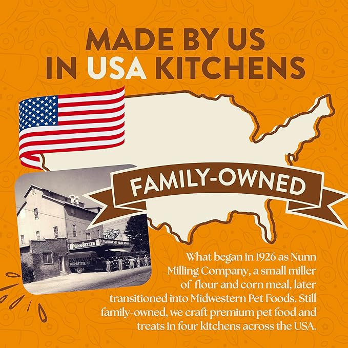 • Grain-free, gluten-free dog nutrition made in USA kitchens.