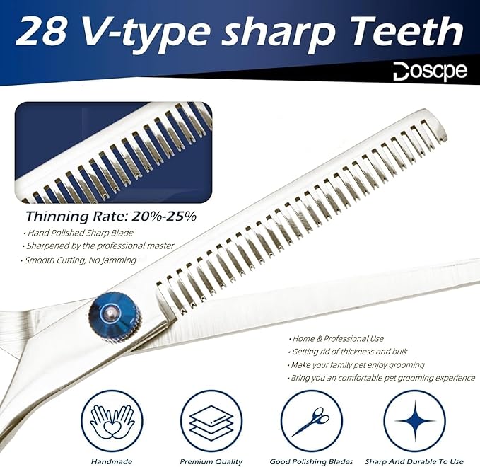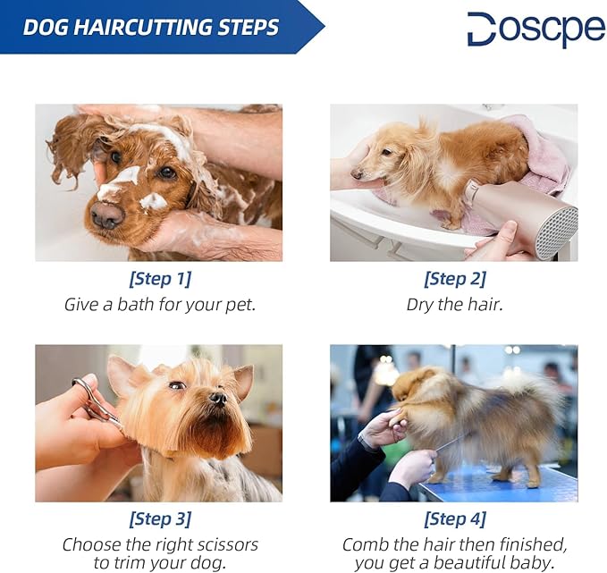 • [Premium Material]: Our Doscpe scissors in this grooming dog shears set is made of high quality stainless steel, and the dog scissors is sharp and durable.
