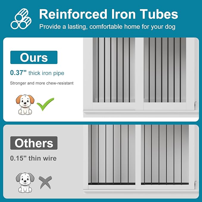 • 【Heavy Sturdy Dog Kennel】Our Large dog cage is made from MDF Boardand iron, this piece of dog furniture is sturdier and more chew resistant than other dog crates, offering a lasting, stable, and safe space for your fur friend. According to the instructions, you can quickly build a warm home for your pets.