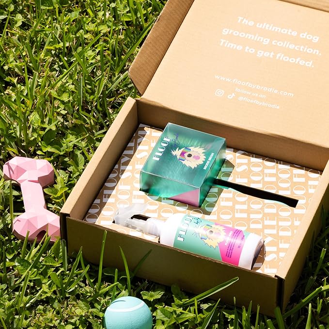 • Floof Juice: our leave-in treatment powered by plant-based emollients and emulsifiers to instantly refreshes their fur but also conditions, banishes frizz, strengthens, and enhances shine