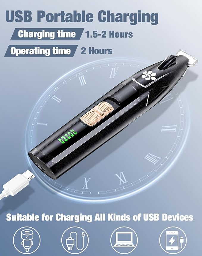 • LED DISPLAY & LED LIGHT - This dog paw trimmer is designed with LED display keeps you informed of the dog grooming clipper's remaining power status. LED light illuminates small areas, making it easier to see and trim your pet's fur with accuracy