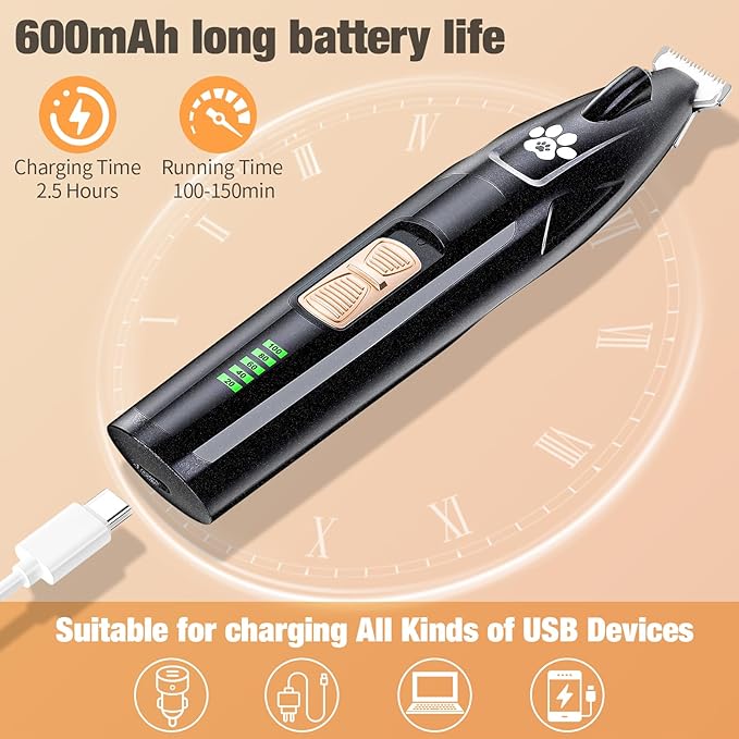 • 🐱【Battery Charge Display】Stay in control with the LED battery display on this advanced dog paw trimmer. Never worry about running out of power mid-grooming! With over 100 minutes of runtime on a single charge, it’s perfect for trimming the claws of dogs, cats, and other pets with ease and efficiency.