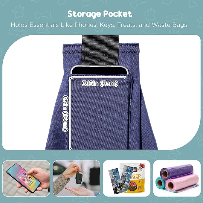• Comfort & Adjustable: Wide, padded straps evenly spread weight, easing shoulder/neck stress. Adjustable for all, with a front pocket for phone, keys, poop bags, keeping essentials handy on walks