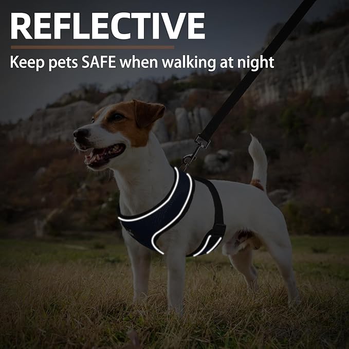 • QUALITY MATERIALS: Made of premium polyester materials, it's adopted with an air-mesh design, so it's very lightweight and breathable. The soft edge keeps the dog always comfortable, it's no pull and no choke. And sturdy webbings make sure the harness can be used for a long period. The metal D-ring will connect to the matching leash to keep the control by you