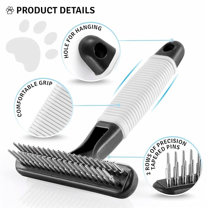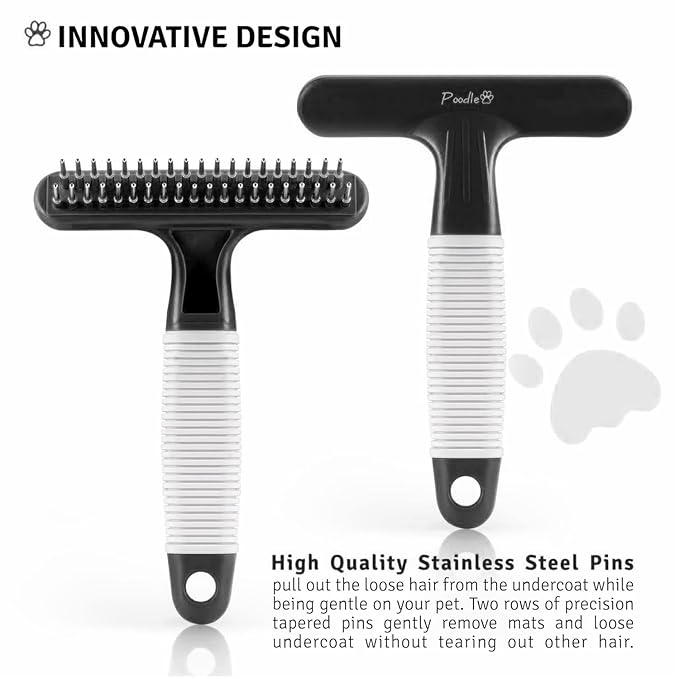 • DOG UNDERCOAT RAKE BY POODLE PET CAN BE USED ON A WET OR A DRY COAT. To relieve tangled knots from dense undercoats, this dog rake is the best option. The specially designed pins pull out the loose hair from the undercoat without hurting the dog. 2 rows of precision tapered pins gently remove mats and loose undercoat without tearing out other hair.
