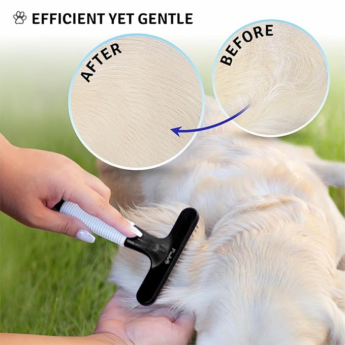 • REDUCE SHEDDING BY UP TO 90% AFTER ONE SESSION: The Poodle Pet rake features smooth, rounded pins that penetrate deep into your dog's coat to remove loose undercoat. While you cannot stop a healthy dog from normal shedding, you can reduce the amount of hair in your home by brushing your dog regularly with the Poodle Pet Dog Rake.
