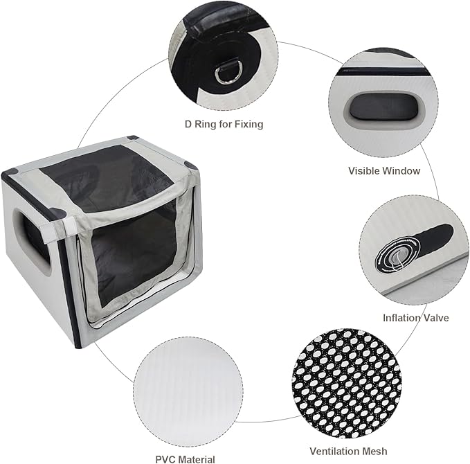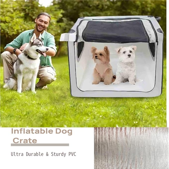 • Durable and Safety : The inflatable dog crate is made with military-grade, puncture-resistant, waterproof, and military-tested PVC materials. With the durability and safety of hard-sided kennels and the convenience of lightweight soft-sided dog kennels, it offers an "airbag function" to maximize impact safety for dogs during travel in case of emergency braking or sudden evasive movement.