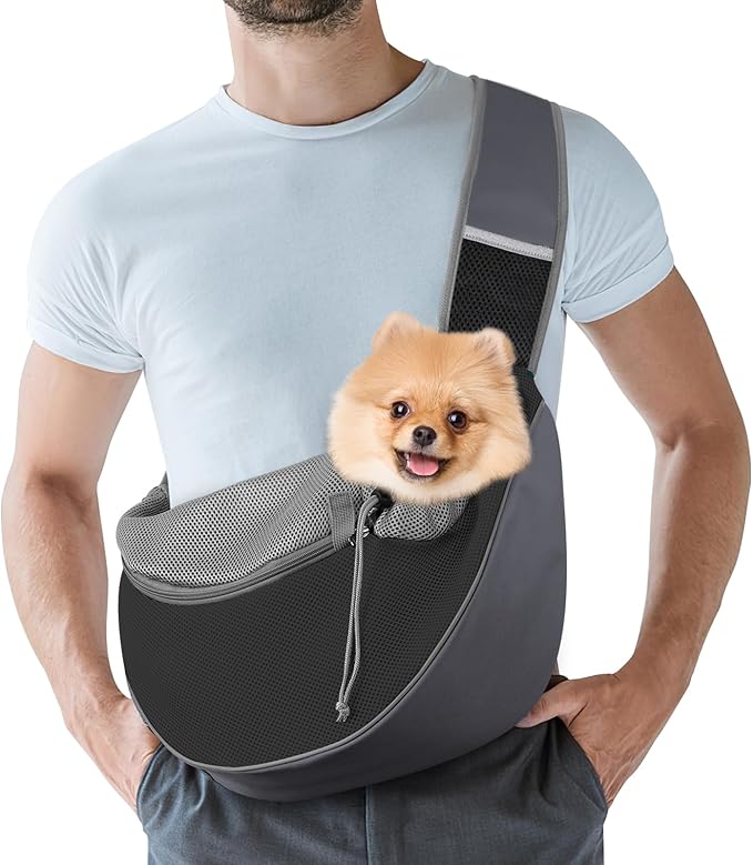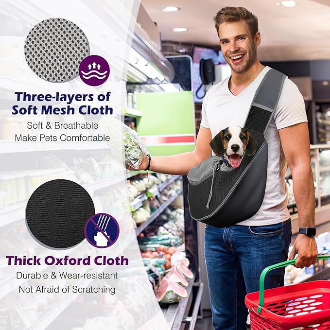 • Safety: Made of oxford cloth and air mesh, this pet sling carrier is stretchy and provides cushioning protection for your pet. The drawstring prevents the dog from accidentally opening the zipper, while also preventing him from chewing the sling bag. Built-in safety collar hook, you can buckle it to the dog's collar or harness to prevent it from falling off.