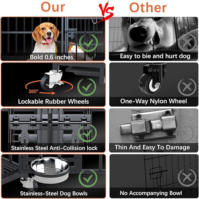 • 【Practical & Easy to Move and Clean】The dog crate comes with four smooth rolling locking wheels for easy movement and fixation, you can easily move the crate to different positions as needed. The dog crate comes with two pull-out tray for easy removal and cleaning. It also comes with a safety latch to avoid your smart dog from opening the iron door, effectively protect your pet.