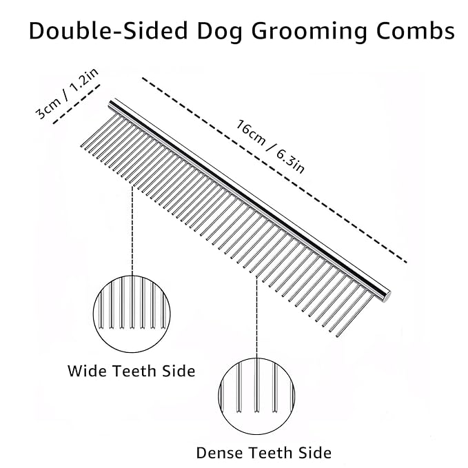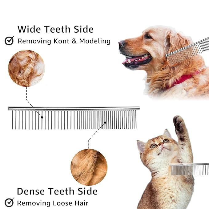 • 【2-in-1 Comb】: Wide sided for comb knot, smoothing and modeling your pet's hair, dense side for removal of loosen hair, you can use it on the legs, head or tail of your pets where the brush can’t