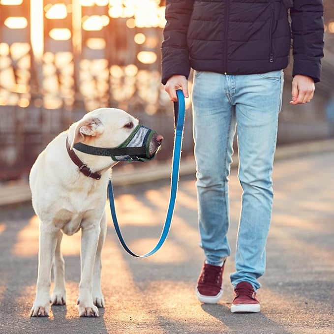 • Breathable Mesh Muzzle: The dog muzzle for large dogs is crafted from high-quality mesh fabric that is lightweight, soft, and long-lasting. Its ultra-breathable design ensures excellent ventilation, allowing dogs to breathe easily. The soft padding at the front of the muzzle protects the dog's nose from friction, offering an extra level of comfort.