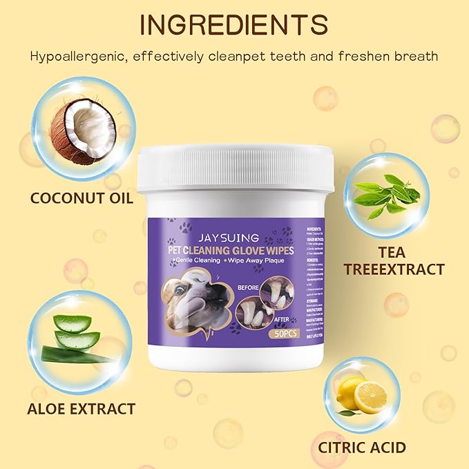 • SAFE AND NATURAL INGREDIENTS: Made with natural plant extracts such as organic coconut oil and aloe vera, our dog teeth cleaning wipes are alcohol-free and chemical-free, making them safe for dogs and cats with sensitive teeth and gums. They are also safe to lick or swallow