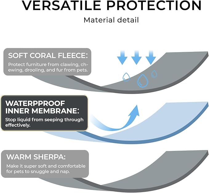 • TRIPLE LAYERS DESIGN - Soft thick fleece on one side and plush sherpa backing on the other to keep your pets comfy, warm and dry. Internal waterproof lining provides defense and stops liquids from seeping through. NOTE: The surface of the fiber itself is not waterproof!