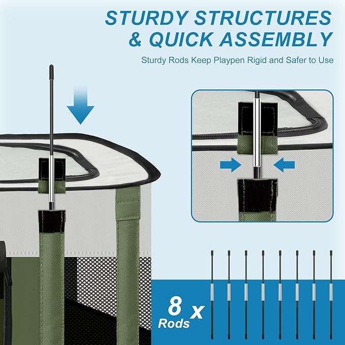 • 【No Assembly required】Opening the dog pen takes only a few seconds, is lightweight, strong, and does not require assembly. When not in use, it can be folded into the tote bag provided by us, which takes up minimal space and is easy to carry and store. Spacious interior Spaces allow your pet to play, sleep, hide or isolate. Perfect for indoors, lawns, beaches, parks, Tours, camping and more!