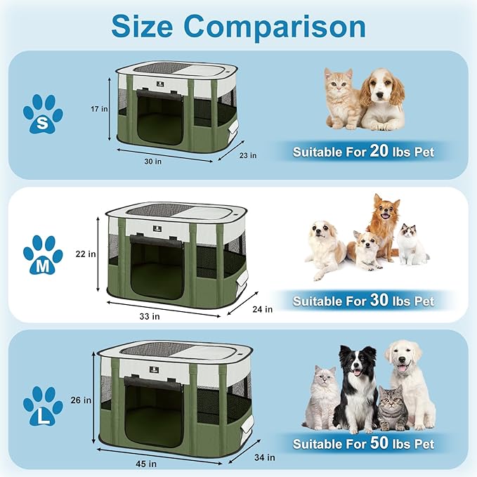 • 【Suitable for various pets】Suitable for cats, dogs, rabbits, chickens, ferrets, hamsters, pregnant pets, etc. Small -30 x 23 x 17 inches, suitable for small pets under 20 pounds; Medium -33 x 24 x 22 inches, suitable for pets up to 30 pounds; Large 45 x 34 x 26 inches, suitable for pets under 50 pounds. Please measure your pet before purchasing to choose the right size