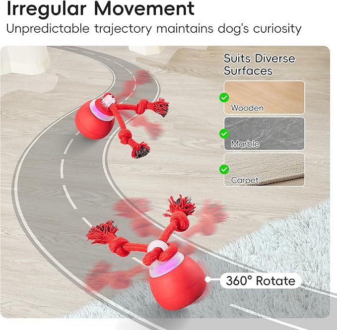 • Interactive Rolling Ball for Active Play – This motorized dog ball toy rolls around with a moving rope attachment, providing an enticing chase that keeps small and medium dogs entertained. Perfect for puppies and chewers, this funny and smart design stimulates their natural hunting instincts, making playtime extra exciting.