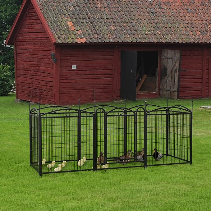 • 【Safe & Secure】: Featuring an automatic gravity-actioned locking system and stakes with round ball tips, the playpen keeps your pets safe and prevents them from rushing out, while also protecting you and your animals from injury.