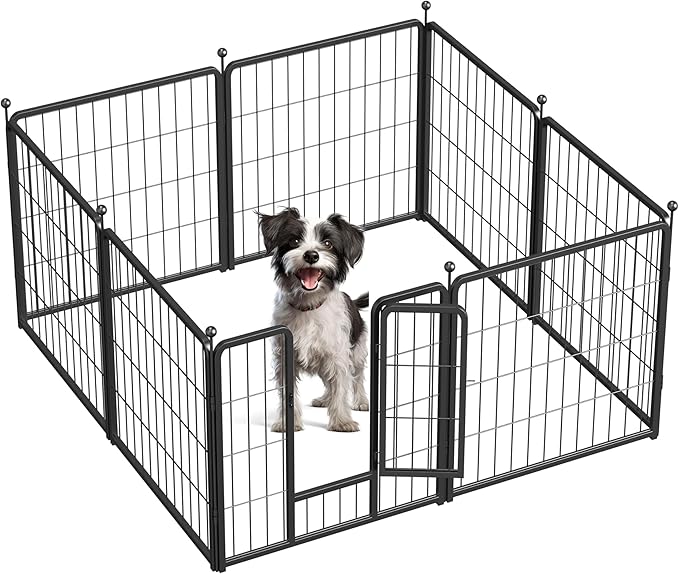 • 【Upgraded Dog Playpen】Playpen dog for medium dogs adopts gravity door lock design, much safer and more convenient. Made of heavy duty metal panels and stakes with black coating, non-toxic, anti-rust. Ensures long time use no matter indoor or outdoor.