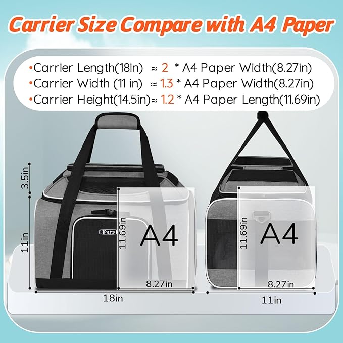 • 【AIRLINE APPROVED CARRIER 】Unfolded size:18"L×11"W×(11+3.5)"H, Petskd pet carrier is TSA approved and can be placed under the seat in the cabin, it is mainly designed for ①Delta Airlines:18x11x11" ②United Airlines:18x11x11" ③American Airlines:18x11x11". We recommend you buy this carrier when you fly with the above-mentioned airlines.