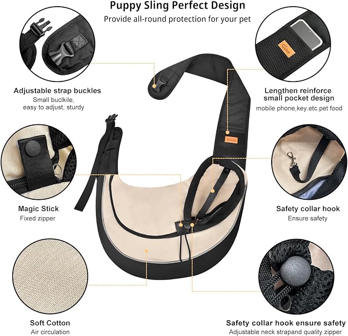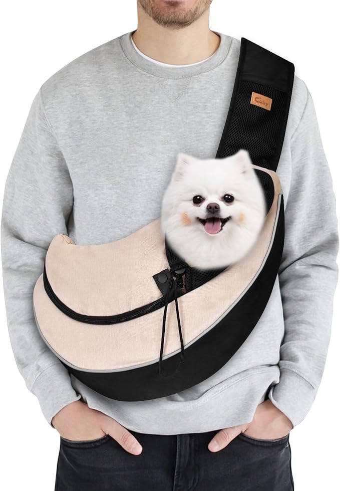 Cuby Pet Sling Carrier for Small Dogs Cats,Drawstring & Zipper Security Hook Triple Design for Pets' Securty Dog Bag,Breathable Travel Puppy Sling Carrier with Adjustable Strap(Beige,L(9.5-13.5 lbs))
