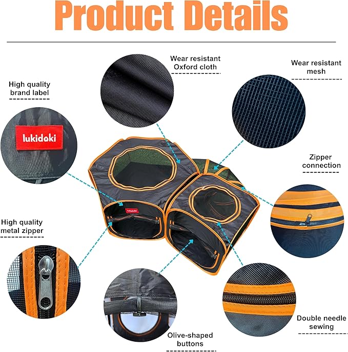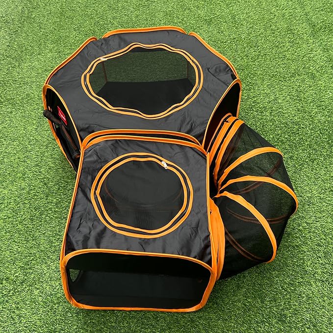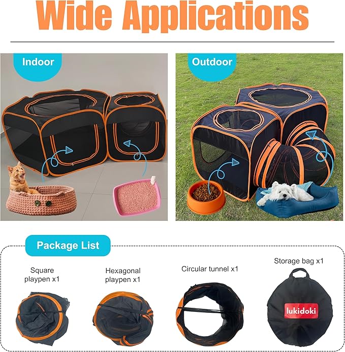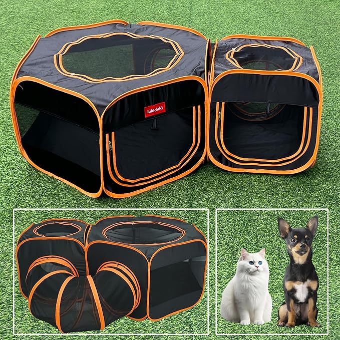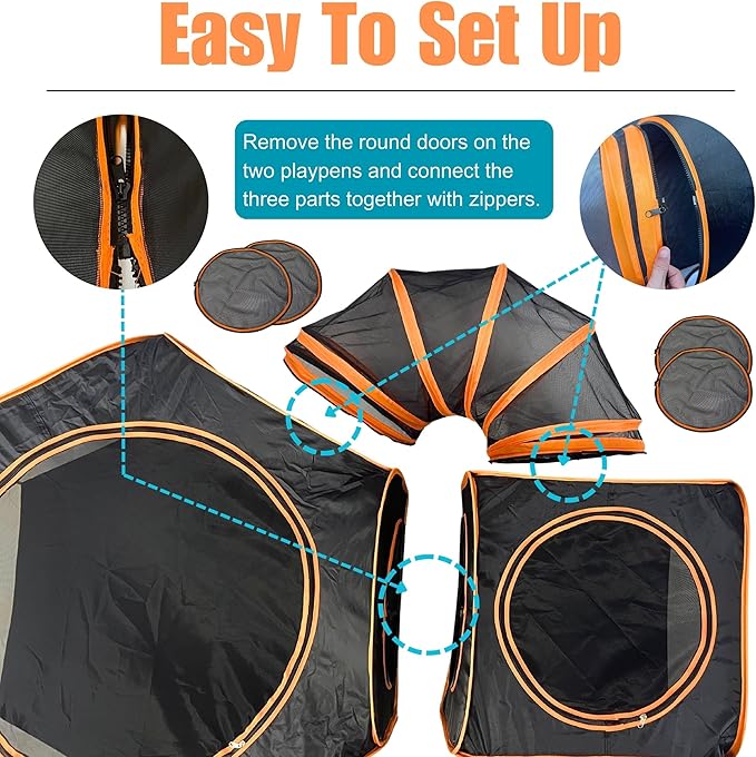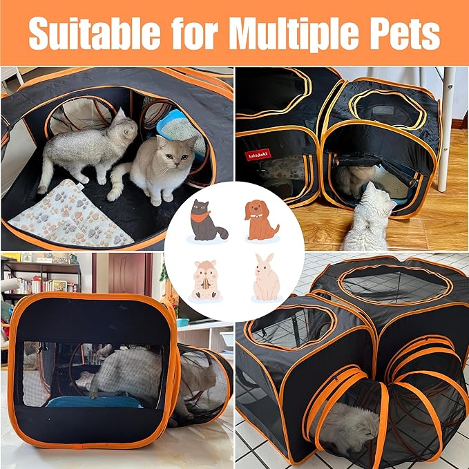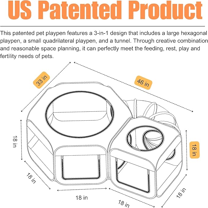 - 【Spacious & Comfortable】-- With dimensions of 46"L x 33"W x 18"H, this playpen provides ample space for 1-3 cats or 1-2 puppies to rest, play, and bask in the sun. It includes a 33" diameter hexagon playpen, a 18" quadrilateral playpen, and an U-shaped tunnel. Each playpen features detachable circular zipper doors for easy configuration and access.