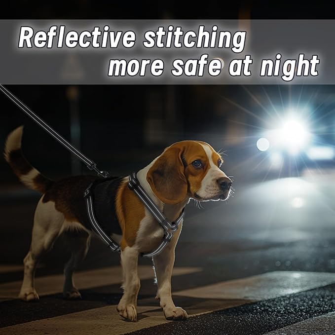 • Built in Reflective stitching: The harness set has two lines of reflective stitching along the top and bottom edges from webbing, They are reflective which will help protect them at night. When it is reflected by light, it will automatically emit light to keep your dog visible even at night,offering peace of mind during your evening strolls.