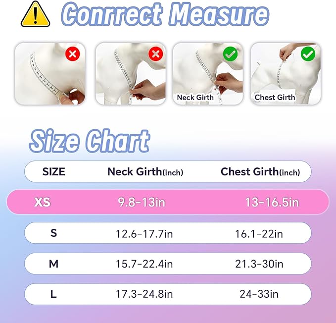 This size XXS harness is perfect for my small, 3-month-old puppy. The neck and chest measurements fit perfectly! It's easy to use, and the color is adorable. The padding is secure yet comfortable for him, and it's super easy to wash. I also bought the matching leash and love them both!