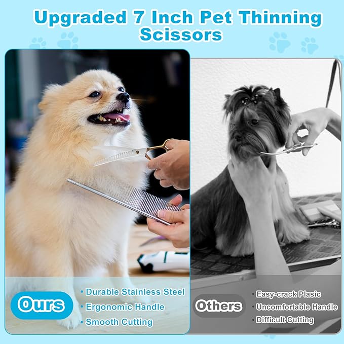 • Stainless Steel:Crafted from high-quality stainless steel, these 7-inch pet thinning scissors are built for long-lasting performance. for regular grooming sessions, ensuring durability and sharpness with every use.
