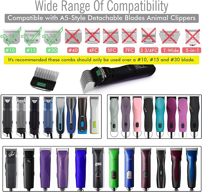 • Compatible with Oster A6, Golden A5, Turbo A5, Andis AG, BG, AGC, BDC, DBLC, FHC, MBG, SMC, SMX, BGR and KM2, KM5, KM10, KM Cordless, Thick Coat Clipper, SS Pro, Power Grip, etc.