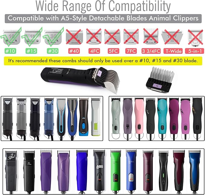 • Compatible with Oster A6, Golden A5, Turbo A5, Andis AG, BG, AGC, BDC, DBLC, FHC, MBG, SMC, SMX, BGR and KM2, KM5, KM10, KM Cordless, Thick Coat Clipper, SS Pro, Power Grip, etc.