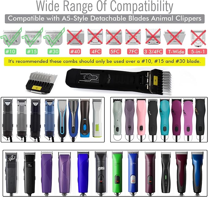 • Compatible with Oster A6, Golden A5, Turbo A5, Andis AG, BG, AGC, BDC, DBLC, FHC, MBG, SMC, SMX, BGR and KM2, KM5, KM10, KM Cordless, Thick Coat Clipper, SS Pro, Power Grip, etc.
