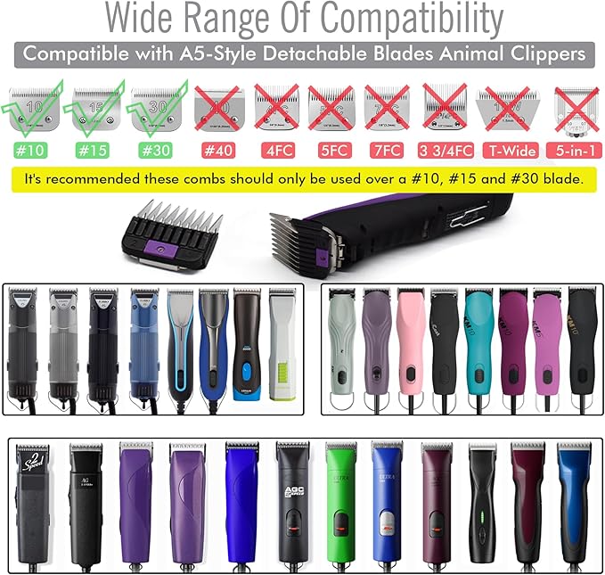 • Compatible with Oster A6, Golden A5, Turbo A5, Andis AG, BG, AGC, BDC, DBLC, FHC, MBG, SMC, SMX, BGR and KM2, KM5, KM10, KM Cordless, Thick Coat Clipper, SS Pro, Power Grip, etc.