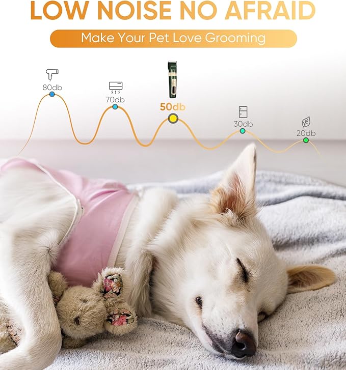 • 【Low-noise design】Engineered to run at a hushed 50 decibels, the dog clipper for grooming ensures a peaceful experience. The subtle sound it produces won't startle your pet, making the trimming process smooth and stress-free