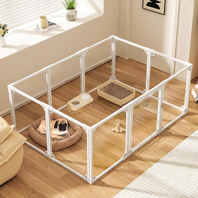 • 【Sturdy, Durable, and Stylish】The dog play pen combines square tube aluminum alloy and acrylic for superior stability. Its modern design complements any décor style, adding elegance to your home.